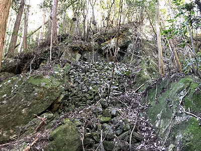 発見の詳細は不明である。東京地学協会発行の「日本鉱産誌」には、昭和21〜22年に稼行した記録が見られる。マンガンを採掘した鉱山である。山口県下松市から広島県大竹市にかけて数多くのマンガン鉱山が存在していた。この鉱山もその中の1つだが、小規模の鉱山だったようだ。マンガンの品位は35〜40%とされている。中生層の玖珂層群のチャート中の層状マンガン鉱床である。吉村豊文教授記念事業会編集発行、九州大学理学部研究報告、吉村豊文氏記載の「日本のマンガン鉱床補遺」には鉱床の詳細な位置図が示されている。また、こちらの資料には昭和34年に稼行した記録が残されている。近くの高森鉱山の支山として稼行していた時期もあったようだ。高森鉱山よりは分かり易い位置にあるが、近くの県道には割合新しい熊出没注意の看板がある。現地は県道から小さな川に沿って北に延びる林道を進んで行った所にある。鉱山は小さな川を渡った所にあり、山肌に石積みが見られ一見して不自然であることから鉱山跡であることが分かる。坑口は石積みの上にある。石積みの下やその左側には川までの間にズリが見られる。ズリで見られる鉱物は、方鉛鉱、閃マンガン鉱、ネオトス石、パイロファン石、菱マンガン鉱、テフロ石、満礬ザクロ石、単斜鉄末野閃石、単斜末野閃石、パイロクスマンガン石、バラ輝石、滑石などである。特にパイロクスマンガン石は時に結晶面が確認できるものがあり、赤味が強く色が濃いものが見られる。一般的にバラ輝石との同定は難しいが、この産地のものはバラ輝石は極めて希でザラザラしており、ピンク色のもののほとんどはパイロクスマンガン石である。また極めて希にコバルト華が見られる。 |