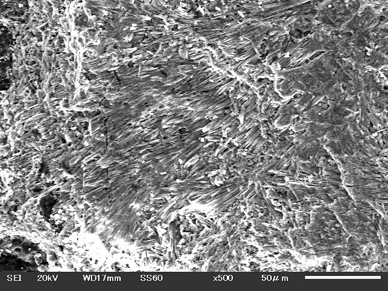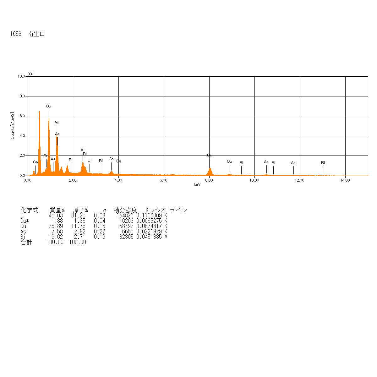 | [理想化学式] BiCu6(AsO4)3(OH)6・3H2O 銅とビスマスの砒酸塩鉱物である。色は明るい緑色または水色であるが、緑色のものは通常の緑色といった色ではない。ややくすんでいたり淡いものが多い。一般的に結晶は針状、柱状結晶が放射状に集合しているものが多い。羽毛状の結晶が集合しているものもある。ミクサ石やアガード石はミクサ石グループを構成しているが、ミクサ石グループはこうした結晶をなしているか皮膜状のものがほとんどである。六方晶系である。硬度は3〜4、比重は3.8とされている。チェコの鉱山技師のアントン・ミクサ氏に敬意を表したオーストリアの鉱物学者のアルブレヒト・シュラウフ氏により名付けられたそうだ。海外ではイギリス、ドイツ、ギリシャ、アメリカなどで産出する。日本での産地は今のところ大和鉱山の他、栃木県の日光鉱山、岐阜県の一柳鉱山などで産出が確認されており希な鉱物である。南生口鉱山のミクサ石はズリ中の石英の表面に希に産出する。ズリ中には自然蒼鉛、輝蒼鉛鉱などのビスマスの金属鉱物は今のところ確認していないが、泡蒼鉛、ケヒリン石などのビスマスの二次鉱物は確認している。ただ、結晶構造が類似するアガード石類も見られるため同定は難しいが、一般的に青味を帯びたり、淡色のものはミクサ石の可能性が高い。拡大写真の淡い水色を帯びる緑色の鉱物が本鉱で、顕微鏡写真でも皮膜状にしか見えないが、電子顕微鏡では針状結晶が集合しているのが確認できる。EDSにより分析を行ったところ、ビスマスが検出されビスマス>カルシウムとなっていた。砒素の比率がやや低くなっているが構成元素からミクサ石と同定した。微量ながらセリウム、ネオジウムなどのピークも現れており希元素類も含まれているようだ。 MENUページに戻る 前のページに戻る |