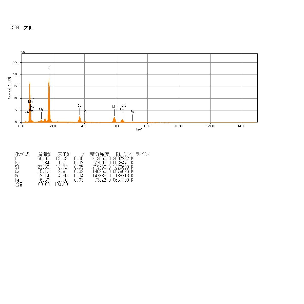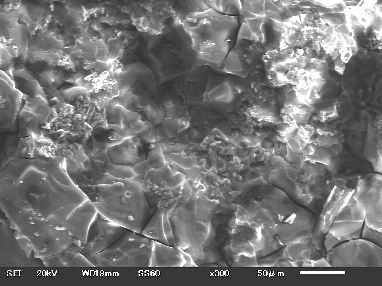 | [理想化学式] CaMnSi2O6 カルシウムとマンガンの珪酸塩鉱物である。色は薄い灰色を帯びる水色のものを多く目にするが、暗褐色、薄茶色、オリーブ色、灰白色、無色のものもあるようだ。半透明または不透明のものが多い。ガラス光沢を示す。単斜晶系である。結晶は日本では柱状のものが集合したものが見られる。海外では針状結晶が集合したもの、単柱状に近いコロッとしたものも見られる。輝石グループに属しており、マンガンを鉄に置換したものは灰鉄輝石となり、マンガンをマグネシウムに置換したものは透輝石となる。灰鉄輝石や透輝石と化学組成上連続し、固溶体を作る。硬度は6で比重は3.6とされている。当初は美しい水色を呈しているものも、次第に退色し、まず薄茶色にその後黒ずんでいき美しい色合いは失われていく。アメリカの岩石学者であるアルバート・ヨハンセン氏に敬意を表して、同じくアメリカの鉱物学者であるヴァルデマー・テオドール・シャラー氏により名付けられた。イタリア、南アフリカ、アメリカ、オーストラリアなど世界の様々な国で見られるが、アフリカ大陸や南アメリカ大陸での産出報告は少ない。日本の産地は埼玉県の秩父鉱山、新潟県の赤谷鉱山、岡山県の名草鉱山または大名草鉱山などあちらこちらで産出している。大仙鉱山のヨハンセン輝石はズリ中に見られるが、他のマンガン鉱物と同様に表面は黒くなっており、割らなければ分からない。割った当初は何の鉱物か分からず、まずX線回折分析を行ったところ輝石グループということが判明した。さらに簡易定量分析を行い鉄、マグネシウムよりマンガンが多いことが分かった。以上の結果から本鉱と同定された。ただX線回折結果のピークがブロードなことから非晶質物質も多く含んでいるようだ。 MENUページに戻る 前のページに戻る |