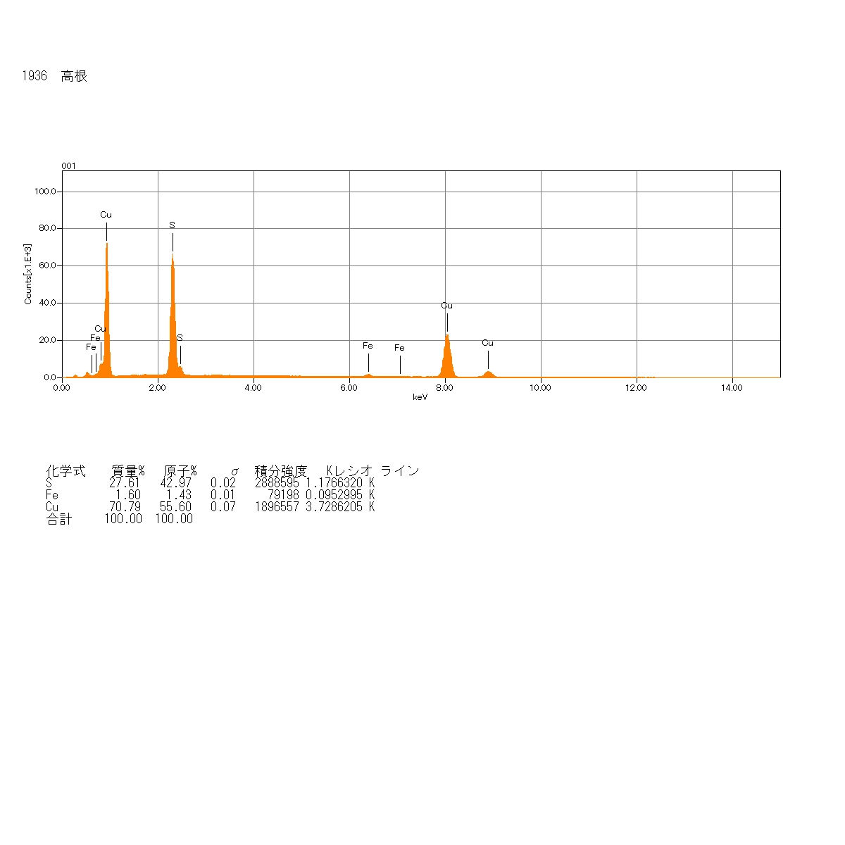 | [理想化学式] Cu8S5 銅の硫化鉱物である。銅と硫黄の比率により別種の鉱物となり、比率の異なるものがいくつかある。輝銅鉱、方輝銅鉱、阿仁鉱、デュルレ鉱、ロクスビー鉱などがあり、どれも似たような外観をしており輝銅鉱グループを形成している。ゲール鉱と呼ばれることもある。自形結晶は未報告とされている。色は青灰色、青味を帯びた黒色、黒色で亜金属光沢、土状光沢を示す。三方晶系(擬立方晶系)だが、塊状を成しているものがほとんどである。硬度は3.5〜4、比重は計算上5.6とされている。共生鉱物は2つのパターンが知られており、1つはスピオンコプ鉱、閃亜鉛鉱、四面安銅鉱類、黄銅鉱、孔雀石、ブロシャン銅鉱、珪孔雀石など、もう1つはスピオンコプ鉱、黄銅鉱、コバルトペントランド鉱、磁鉄鉱、クロム鉄鉱、透輝石、灰鉄ザクロ石などである。アメリカのニューヨーク州セント・ローレンス郡ディカブル・タウンが模式標本地である。最初に標本を採集したアメリカのアダム・カール・ギーア・ジュニア氏に敬意を表して、カナダの鉱物学者であるR・J・ゴーブル氏及びアメリカの鉱物学者であるジョージ・ロビンソン氏により名付けられた。世界ではドイツ、ギリシャ、アメリカ、オーストラリアなど南アメリカ大陸を除くいくつかの国で産出が確認されている。日本では今のところ静岡県の河津鉱山から産出が報告されている。広島県の瀬戸田でも見られたが、目立ちにくいため他の産地もありそうだ。高根鉱山では南側のズリ中に見られた。青味を帯びた黒色、黒色のものが見られX線回折分析を行ったところ、閃亜鉛鉱と同様のピークが見られた。X線回折分析では閃亜鉛鉱とほぼ同じピークが現れることが知られており、EDS分析ではやはり銅と硫黄が検出された。 MENUページに戻る 前のページに戻る |