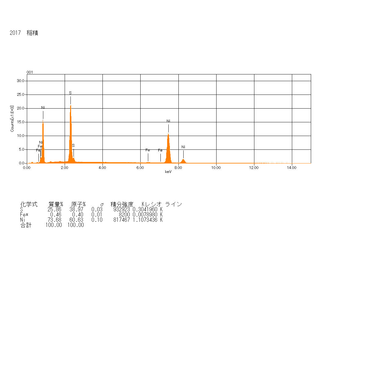 | [理想化学式] Ni3S2 ニッケルの硫化鉱物である。色は淡いブロンズ色、淡い黄鉄色または真鍮色をしている。三方晶系である。塊状のものが多く見られ、海外産のものでも結晶形をはっきり示すものはなかなか見られない。蛇紋岩中に黄鉄鉱のような金色をした鉱物が見られればニッケル鉱物との予想はつくが,針ニッケル鉱、ヒーズルウッド鉱,ペントランド鉱など黄鉄色を示す鉱物もあり、針状結晶が確認できれば針ニッケル鉱と同定可能だが、塊状の場合は同定が難しい。正マグマ鉱床,低温の熱水鉱脈鉱床に産出することが多く、玄武岩質貫入岩中の鉱物として産出する可能性もある。硬度は4、比重は5.8とされている。共生鉱物はペントランド鉱、黄銅鉱、ビオラル鉱、キューバ鉱、針ニッケル鉱、磁鉄鉱、クロム鉄鉱などである。模式標本地であるオーストラリアのタスマニア州ワラタ=ワイナードのヒーズルウッド地区が名前の由来である。名称については、分析を行ったアメリカの鉱物学者で地質学者でもあるジェームズ・ドワイト・デーナ氏により提唱された可能性があるとされている。海外ではロシア、アメリカ、カナダ、オーストラリアなど世界各国で見られる。日本では愛知県の中宇利鉱山、同じく吉川鉱山、鳥取県の広瀬鉱山などで産出が確認されている。稲積鉱山ではズリの一部分の蛇紋岩、クリノクロア中に点々と含まれている。ペントランド鉱と共生しているものも多く見られ、同定が難しい。顕微鏡写真では黄鉄色をしているのが確認できる。超拡大写真ではやや左側中央の金属光沢の部分が本鉱である。EDS分析ではわずかに鉄を含み、ニッケルと硫黄の元素構成比率がほぼ3:2となっている。 MENUページに戻る 前のページに戻る |